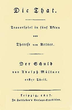 | Deckblatt des Theaterstücks Die That von Therese von Artner. | Therese von Artner: Die That . Hartleben, Leipzig 1817, Cover. | Hartleben / Therese von Artner | Datei:Therese von Artner - Die That.jpg | |