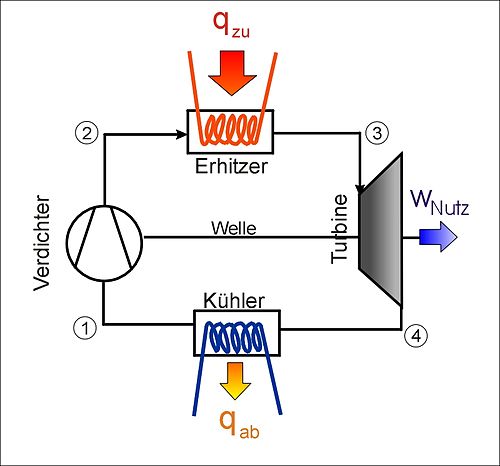 Eine weitere Unterscheidung der Kreisprozesse ergibt sich durch die unterschiedliche Wärmezufuhr. Erfolgt diese intern durch Verbrennung von eingebrachtem Brennstoff, wie beim Verbrennungsmotor oder beim Flugtriebwerk, ist der Kreisprozess offen, weil ein Ladungswechsel zwischen Abgas und Frischluft erfolgen muss. Ein prinzipieller Unterschied aus thermodynamischer Sicht besteht nicht, weil die Atmosphäre als großer Wärmeübertrager betrachtet werden kann. Der Prozess im Bildbeispiel ist ein geschlossener mit zwei Wärmeübertragern. Solche Prozesse können beispielsweise in einem Kernkraftwerk mit gasgekühlten Reaktoren (z. B. Helium als Kühlmittel und Arbeitsfluid) verwendet werden.