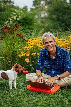 A picture of Thomas Brezina with his dog Joppy in his garden in Vienna. | Eigenes Werk | Pruegl | Datei:Thomas Brezina - Mit Hund Joppy im Garten.jpg |
