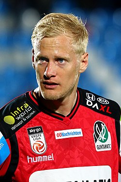 | Fußballmeisterschaftsspiel Erte Liga 2017-18 - SC Wiener Neustadt (weiße Dresen) vs. SV Ried (rote Dressen) 1:0. – Das Bild zeigt Thomas Fröschl | Eigenes Werk | Steindy ( Diskussion ) 19:47, 7 May 2018 (UTC) | Datei:SC Wiener Neustadt vs. SV Ried 2018-04-13 (079).jpg |