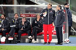 | UEFA Euro 2016 qualifying, Group G – Austria (red shirts) vs. Liechtenstein (blue shirts) 3–0 (1–0) on 2015-10-12 in Ernst-Happel-Stadion , Vienna – The photo shows Marcel Koller (Teamchef of Austria national football team, 2nd from right) with Thomas Janeschitz (assisten coach of Austria national football team, 3rd from right) und Klaus Lindenberger (goalkeeper coach of Austria national football team, middle). | Eigenes Werk | Steindy ( Diskussion ) 20:23, 16 October 2015 (UTC) | Datei:AUT vs. LIE 2015-10-12 (079).jpg | |