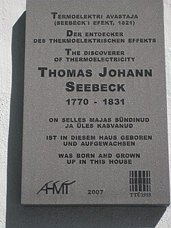 | Tafel am Geburtshaus von Seebeck in Tallinn /Estland | Eigenes Werk | Wilhelmy | Datei:Thomas Johann Seebeck.jpg |