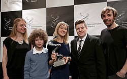 | Anna Heuss , Emilio Bachmann , Magdalena Lauritsch , Thomas Otrok und Jakob Fuhr , das Team des als bester Kurzfilm ausgezeichneten Films Rote Flecken, bei der Vergabe des Österreichischen Filmpreises 2015 im Wiener Rathaus , Wien , Österreich . | Eigenes Werk | Manfred Werner - Tsui | Datei:Österreichischer Filmpreis 2015 Anna Heuss Emilio Bachmann Magdalena Lauritsch Thomas Otrok Jakob Fuhr 1.jpg |