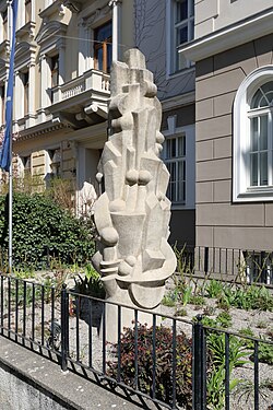 | Die Skulptur „Die Stadt“ im Vorgarten des Hauses an der Adresse Reisnerstraße 43 im 3. Wiener Gemeindebezirk Landstraße. Die Steinskulptur ist ein Werk des oberösterreichischen Bildhauers und Maler Thomas Pühringer (1941–2018) und wurde vor 2012 geschaffen: 1 . | Eigenes Werk | C.Stadler/Bwag | Datei:Wien - Skulptur „Die Stadt“ (Reisnerstraße 43).JPG |