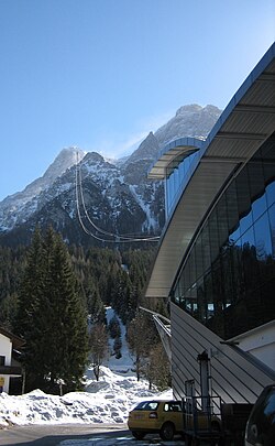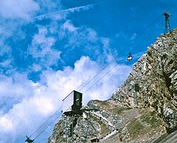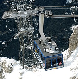 | de:Tiroler Zugspitzbahn ; Blick von der Spitze auf die Kabine oberhalb der 3. Stütze (100 Personen Kapazität) | Eigenes Werk | Crux | Datei:Tiroler Zugspitzbahn Kabine vom Gipfel aus.jpg | |
