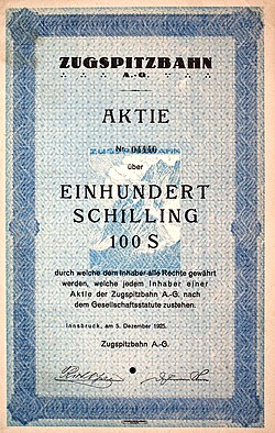 | Aktie über 100 Schilling der Zugspitzbahn AG vom 5. Dezember 1925; Gründeraktie | Sammlung eines Mitglieds des Ersten Deutschen Historic-Actien-Clubs e.V (EDHAC e.V.); (kl) | Unbekannte Autoren und Grafiker; Scan vom EDHAC e.V. | Datei:Zugspitzbahn AG 1925.JPG | |