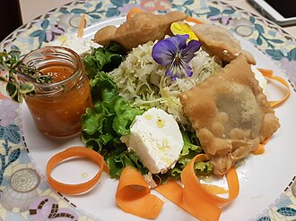 | Tirtln vom Weißkohl, Ziegenfrischkäse, Aprikosenchutney süß-sauer, Frühlingssalate und Hausdressing. Fotografiert im Gasthaus Zur Sonne in Unsere Liebe Frau im Walde, Südtirol, Italien | Eigenes Werk | Benreis | Datei:Tirtln Weisskohl Zur Sonne.jpg |