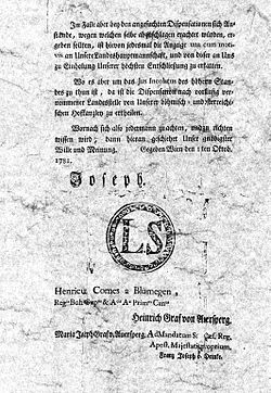 - ↑ Johann Thomas Edler von Trattner: Sammlung der k.k. landesfürstlichen Verordnung in Publico-Ecclesiasticis. Kaiserl. Königl. Hofbuchdruckern und Buchhändlern, Wien 1782 (Online-Version – Patent Nr. 133 vom 13. Oktober 1781).