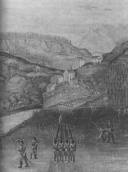| Tosters, Schlacht am Margarethenkapf 1799, Auszug aus Votivbild Kapelle St. Michael Tisis | scan from image Stadtarchiv Feldkirch | Johann Matthias Jehly (1746 - 1809) | Datei:Franzosen.Schlacht am Margarethenkapf.1799.Votivbild.Johann Matthias Jehly.Kirche Tisis.red.JPG | |