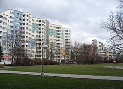 1973 wurde mit den Bauarbeiten an der städtischen Wohnanlage nach Entwürfen der Architekten Fritz Gerhard Mayr, Manfred Schuster und anderen begonnen. Die Anlage wurde sozusagen auf der grünen Wiese in Schwerbetonplattenbauweise errichtet. Bereits 1974 konnten die ersten Wohnungen den Mietern übergeben werden, 1977 wurde die Anlage fertiggestellt. Zum damaligen Zeitpunkt gab es rund 10.000 Bewohner.