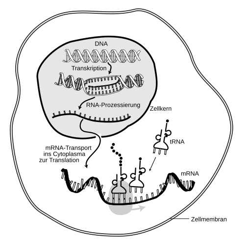 | Illustration of transcription and translation . In the nucleus, DNA is transcribed to mRNA. After being exported to the cytosol, the mRNA molecule is bound by a ribosome and is translated using tRNAs, which match amino acids to codons in the mRNA. | Eigenes Werk mittels: mRNA illustration, NIH | National Human Genome Research Institute, NIH | Datei:MRNA-interaction.svg | |