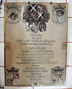 | Augsburg, Dom, äußerstes nördliches Seitenschiff; Epitaph für Johann Rupert von Trauner († 14. März 1788). Signiert Gözel (Joseph Götzel). Mit gestürztem Wappen Trauner und Ahnenwappen Edlweckh, Trauner, Waldkirch, Bodman. | Eigenes Werk | UliE1350 | Datei:Augsburg Dom Epitaph Trauner 01.jpg | |