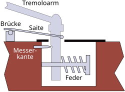 - Federhalter – die Federn sind am Federhalter aufgehängt. Der Federhalter kann mit Hilfe zweier Schrauben so eingestellt werden, dass das Tremolo bei Nichtgebrauch in der schwebenden Grundstellung verbleibt.