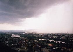 Kurz vor dem Zentrum fließt der Kanal Kočkovský kanál mit der Waag zusammen, während weiter flussabwärts der Kanal Biskupický kanál abzweigt.