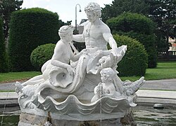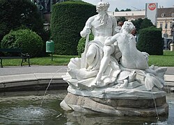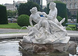 | Brunnen B (Naturhistorisches Museum / Burgring, Anton Schmidgruber): Die insgesamt vier Tritonen- und Najadenbrunnen bilden die Zentren der vier großen Rasenflächen, welche durch die Hauptverbindungswege des Maria-Theresien-Platzes gebildet werden. Errichtet wurden die Brunnen in den Jahren 1887 bis 1890. | Eigenes Werk | GuentherZ | Datei:GuentherZ 2009-07-06-B 0471 Tritonen- und Najadenbrunnen M-T-Platz.jpg | |