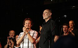 | 200. und letzte Ausgabe der Radiosendung Trost und Rat mit Willi Resetarits . Ernst Molden und der Stubnblues auf der Tschauner-Bühne in Wien. | Eigenes Werk | Manfred Werner - Tsui | Datei:Trost und Rat - 200. Sendung 38.jpg | |