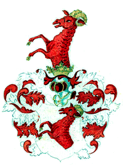 Blasonierung: Das Stammwappen laut Siebmacher zeigt in weißem Schild einen wachsenden, springenden, roten Steinbock mit gelben Hörnern; auf dem Schild ein geschlossener bekrönter Helm mit dem springenden Steinbock, wie im Wappen; die Helmdecken sind rot und weiß.