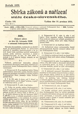 | Czecho-slovak Collection of Laws and Regulations' official issue with the constitutional act No. 328/1938 Coll. (Autonomy of Subcarpathian Rus) | Stejnopis Sbírky zákonů a nařízení státu česko-slovenského | Národní shromáždění Republiky Československé | Datei:Act of Subcarpathian Rus Autonomy 1938.png | |