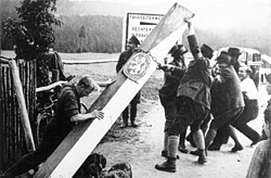 | Es folgt die historische Originalbeschreibung , die das Bundesarchiv aus dokumentarischen Gründen übernommen hat. Diese kann allerdings fehlerhaft, tendenziös, überholt oder politisch extrem sein. Zentralbild/CTK 19.9.1938 Nach der Unterzeichnung des Münchener Abkommens am 29.9.1938 durch Hitler, Daladier, Chamberlain und Mussolini okkupierte das faschistische Deutschland bedeutende Grenzgebiete der tschechoslowakischen Republik. UBz: wie Henlein-Faschisten (Angehörige der Nazipartei im Sudetenland) die Grenzpfähle an der deutsch-tschechoslowakischen Grenze in Erwartung des deutschen Einmarsches beseitigen. | Dieses Bild wurde im Rahmen einer Kooperation zwischen dem deutschen Bundesarchiv und Wikimedia Deutschland aus dem deutschen Bundesarchiv für Wikimedia Commons zur Verfügung gestellt. Das deutsche Bundesarchiv gewährleistet eine authentische Bildüberlieferung nur durch die Originale (Negative und/oder Positive), bzw. die Digitalisate der Originale im Rahmen des Digitalen Bildarchivs . | Autor/-in unbekannt Unknown author | Datei:Bundesarchiv Bild 183-58507-003, Besetzung des Sudetenlands, Grenzpfahl.jpg | |