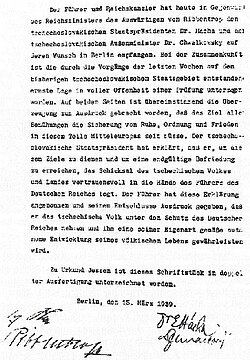 | Die Proklamation aus dem 15. März 1939. Der Führer und Reichskanzler hat heute in Gegenwart des Reichsministers des Auswärtigen von Ribbentrop den tschechoslowakischen Staatspräsidenten Dr. Hacha und den tschechoslowakischen Außenminister Dr. Chwalkowsky auf deren Wunsch in Berlin empfangen. Bei der Zusammenkunft ist die durch die Vorgänge der letzten Wochen auf dem bisherigen tschechoslowakischen Staatsgebiet entstandene ernste Lage in voller Offenheit einer Prüfung unterzogen worden. Auf beiden Seiten ist übereinstimmend die Überzeugung zum Ausdruck gebracht worden, daß das Ziel aller Bemühungen die Sicherung von Ruhe, Ordnung und Frieden in diesem Teile Mitteleuropas sein müsse. Der tschechoslowakische Staatspräsident hat erklärt, daß er, um diesem Ziele zu dienen und um eine endgültige Befriedung zu erreichen, das Schicksal des tschechischen Volkes und Landes vertrauensvoll in die Hände des Führers des Deutschen Reiches legt. Der Führer hat diese Erklärung angenommen und seinem Entschlusse Ausdruck gegeben, daß er das tschechische Volk unter den Schutz des Deutschen Reiches nehmen und ihm eine seiner Eigenart gemäße autonome Entwicklung seines völkischen Lebens gewährleisten wird. Zu Urkund dessen ist dieses Schriftstück in doppelter Ausfertigung unterzeichnet worden. Berlin, den 15. März 1939. die Unterschriften Adolf Hitler, Ribbentrop, Dr. E. Hacha, Dr. Chvalkovsky | http://www.mzv.cz/wwwo/default.asp?id=27546&ido=14523&idj=1&amb=2 (404) text see also NS Archiv https://www.ns-archiv.de/krieg/1938/tschechoslowakei/vertrauensvoll-15-03-1939.php | German and Czechoslovakia governments | Datei:Declaration 1939.jpg | |