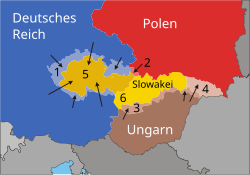 Am 6. Oktober 1938 unterzeichneten Hlinkas Slowakische Volkspartei sowie weitere slowakische Parteien und Politiker das Abkommen von Žilina (Silleiner Abkommen), in dem sie sofortige Autonomie und die Bildung einer slowakischen Landesregierung unter Jozef Tiso verlangten. Die Zentralregierung in Prag willigte am Folgetag ein. Im Namen der Republik wurde daraufhin ein Bindestrich zwischen Tschecho-Slowakei eingesetzt.[5] Am 8. Oktober beauftragte Hitler Außenminister Ribbentrop, die neue Autonomie der Slowakei und Karpatenukraine stark zu fördern, um später den tschechoslowakischen Staat zerschlagen zu können. In Bratislava wurde eine neue Deutsche Partei gegründet, die ähnlich der Sudetendeutschen Partei mit der nationalsozialistischen Regierung im Deutschen Reich sympathisierte. Ihr Führer Franz Karmasin wurde zum „Staatssekretär für die Belange der deutschen Volksgruppe“ in der slowakischen Landesregierung ernannt. In den tschechischen Grenzgebieten hielt die Gewalt dabei weiter an und es kam zu bitteren Gefechten zwischen tschechischen Partisanen und der deutschen Wehrmacht, eine ursprünglich geplante britische Grenzmission wurde daraufhin aufgegeben. Am 10. Oktober besetzten die Deutschen Petržalka.