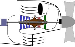 | Turboprop mit Freilaufturbine. Die Welle der Nutzturbine (grün) ist nicht mit der Welle des Gasgenerators (rot) verbunden. Die Turbine des Gasgenerators treibt den Verdichter (blau) und Hilfsaggregate (links), die Nutzturbine wirkt auf das Propellergetriebe (rechts). Einbaulage des Triebwerks um 180° Grad in Flugrichtung gedreht. | Eigenes Werk | Thuringius | Datei:Turboshaft engine free power turbine.svg | |