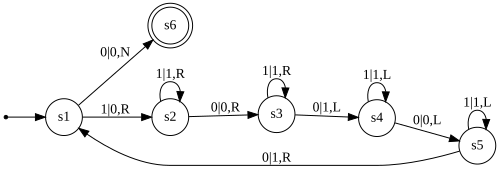 Fleißiger Biber Turingmaschine mit 2 Zuständen (+Endzustand) | Eigenes Werk | Wdvorak | Datei:Busy beaver 2-state.svg | |
