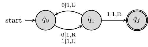 Überführungsgraph für eine deterministische Ein-Band-Turingmaschine, die die Anzahl von Einsen auf dem Band verdoppelt. | Eigenes Werk | VagusBirk | Datei:ÜberführungsgraphBspSVG.svg |