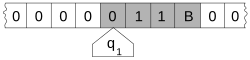 Animation einer Turingmaschine die für eine Eingabe von Einsen eine weitere Kopie der Eingabe anlegt, die durch eine „0“ von der Eingabe getrennt ist, am Beispiel der Eingabe „11“. | Eigenes Werk | Wdvorak | Datei:Turing Maschine.gif | |