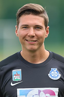| FCM Traiskirchen Kader für die Saison 2016/17. – Das Foto zeigt Torwart Udo Siebenhandl. | Eigenes Werk | Steindy ( Diskussion ) 13:09, 23 July 2016 (UTC) | Datei:FCM Traiskirchen 2016-17 – Udo Siebenhandl (01).jpg | |