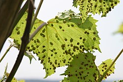 Im späten 19. Jahrhundert kam es zu einer Krise in der europäischen Weinwirtschaft, die durch großflächige Zerstörungen der Weinkulturen durch den echten Mehltau, die Peronospora und die aus den USA eingeschleppte Reblaus ausgelöst wurde.[19] Da die europäischen Rebsorten keinen Abwehrmechanismus gegen den neuen Schädling hatten, vernichtete die Reblaus den Großteil der europäischen Weinsorten. Nachdem sie 1869 in Österreich-Ungarn das erste Mal nachgewiesen wurde, wurde sie mit teils drastischen Mitteln bekämpft – unter anderem mit hochgiftigen Bleimischungen.[20] Gleichzeitig wurde versucht, anderweitig Wein zu produzieren – im niederösterreichischen Tullnerfeld etwa durch verstärkten Ribiselanbau.