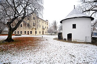 | Südöstlicher Wehrturm und im Hintergrund das Schloss Mörtenegg in der Schlossgasse 4/St. Martiner Straße 11, Stadtteil Sankt Martin (Fellach) in Villach, Kärnten, Österreich | Eigenes Werk | Johann Jaritz | Datei:Villach Sankt Martin Schlossgasse 11 Suedostturm am Schloss Moertenegg 04122009 27.jpg |