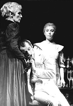 | ADN -Zentralbild (Image Centre) – Reiche – 18 November 1983 – Berlin: The premiere of Ghosts by Henrik Ibsen on 18 November 1983 in the reopened Kammerspiele ( Chamber Play Theatre ). Under the direction of Thomas Langhoff, Inge Keller (left) played Mrs. Alving, Ulrich Mühe (middle) her son Osvald, and Simone von Zglinicki the maid Regine Engstrand (right). The Norwegian family drama is one of the scandal-ridden pieces of the 19th century; when it was released it caused a storm of indignation, and it was only successful on the Berlin stage. | Deutsches Bundesarchiv ( German Federal Archives ), Bild 183-1983-1118-005 | Reiche, Hartmut | Datei:Bundesarchiv Bild 183-1983-1118-005, Berlin, "Gespenster".jpg | |