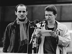 | ADN -Zentralbild (Image Centre) – Link – 4 November 1989 – Berlin: Demonstration. Five hundred thousand citizens took part in a demonstration regarding the content of Articles 27 and 28 of the Constitution of the German Democratic Republic . The actors Johanna Schall and Ulrich Mühe speaking, photographed at the subsequent meeting on the Alexanderplatz . | Deutsches Bundesarchiv ( German Federal Archives ), Bild 183-1989-1104-034 | Hubert Link | Datei:Bundesarchiv Bild 183-1989-1104-034, Berlin, Demonstration, Rede Schall, Mühe.jpg | |
