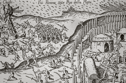| View of Buenos Aires shortly after its founding by Pedro de Mendoza y Luján in 1536. | Ulrich Schmidel published in 1567 in Germany his travel report "Wahrhaftige Historien. Einer Wunderbaren Schiffahrt / welche Ulrich Schmiedel von Straubing / von Anno 1534 biß Anno 1554 in Americam oder Neuwewelt / bey Brasilia und Rio della Plata gethan. ..." which included the present drawing. | Theodor de Bry | Datei:Buenos Aires shortly after its foundation 1536.png | |