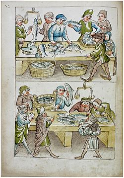 | Rosgartenmuseum Konstanz, Hs. 1, Richental: Konzilschronik. In: Feger, Otto (Bearb.): Ulrich Richental: Das Konzil zu Konstanz. Faksimile. Starnberg - Konstanz 1964. Fol. 24v | prometheus.uni-koeln | Ulrich Richental | Datei:Konstanzer Richental Chronik Verkauf von Fischen 24v.jpg |