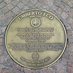 | A metal plaque set in the sidewalk at Circular Quay in Sydney commemorating author Umberto Eco as part of the Sydney Writers Walk series | Eigenes Werk | Snapandrattle33 | Datei:Umberto Eco plaque in Sydney Writers Walk.jpg | |