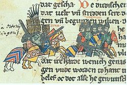 Lechfeldschlacht in der Sächsischen Weltchronik, um 1270. Gotha, Forschungs- und Landesbibliothek, Ms. Memb. I 90, fol. 87v | Scan aus Buch: Matthias Springer, 955 als Zeitenwende - Otto I. und die Lechfeldschlacht, in: Matthias Puhle (Hrsg.): Otto der Große. Magdeburg und Europa, S.199-208, hier: S. 201. | Autor/-in unbekannt Unknown author | Datei:Lechfeldschlacht in der Sächsischen Weltchronik 002.jpg | |