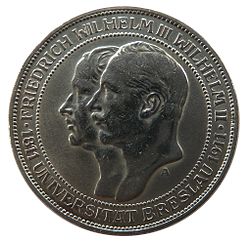 | Vorderseite der 3-Mark-Gedenkmünze Preußens anlässlich der Jahrhundertfeier der Universität Breslau | Eigenes Werk | Jobel | Datei:3 Mark Preußen Uni Breslau VS.jpg | |