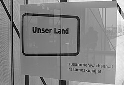 | Hinweisschild auf die Versöhnungsinitiative Unser Land (Kärnten) zwischen deutsch- und slowenischsprachigen Kärntnern am Klagenfurt Hauptbahnhof in Klagenfurt in Kärnten / Österreich / Europäische Union . | Eigenes Werk | Joadl | Datei:Unser Land Kärnten 2012a.JPG |