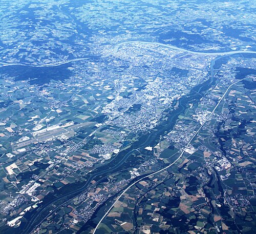 - Traun mit breiter Nieder- und Hochterrasse und dichtem Siedlungsgebiet.