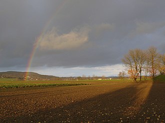 - Die landwirtschaftlich geprägte Niederterrasse ist dicht bebaut. Trockene Eichen-Hainbuchenwälder wechseln sich mit Schwarzerlen-Feuchtwälder ab. Die wenigen Bäche des Gebiets versickern in Schottergruben.