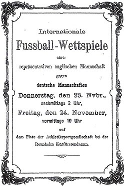 | Anzeige zu den sogenannten Ur-Länderspielen im November 1899 gegen englische Mannschaften | Bernd-M. Beyer: „Der König aller Sports“. Walther Bensemanns Fußball-Glossen . Verlag Die Werkstatt, Göttingen 2008, ISBN 978-3-89533-603-4 , p. 28 | unbekannt | Datei:Anzeige Fussball Wettspiele 1899.jpg |