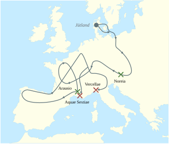 | Karte von Wanderungen und Invasionen der Kimbern und Teutonen Kimbrische und teutonische Niederlagen Kimbrische und teutonische Siege | File:Cimbrians and Teutons invasions.svg (original English version), see for more source information | Diese W3C- unbestimmte Vektorgrafik wurde mit Inkscape erstellt . | Datei:Wanderung der Kimbern und Teutonen.svg |