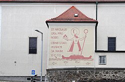 | Ein großes Nikolaus -Sgraffito (7×8m) an der Südostfassade der Urfahraner Josefskirche . Der Heilige steht als Bischof mit dem Attribut Buch und drei goldene Kugeln auf einem stilisierten Boot. Die zweisprachige Inschrift in Lateinisch und Kirchenslawisch bedeutet: „Hl. Nikolaus bitte für uns.“ Künstler ist Rudolf Gruber, Herbst 1970 1 | Eigenes Werk | Christoph Waghubinger ( Lewenstein ) | Datei:Nikolaus-Sgraffito an der Urfahraner Josefskirche 1.jpg | |