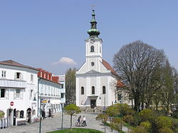 Der für die Kapuziner typisch schlichte Kirchenbau hat ein einschiffiges tonnengewölbtes Langhaus und einen eingezogenen niedrigeren tonnengewölbten Rechteckchor. Südlich am Langhaus ist eine Seitenkapelle als Taufkapelle mit einem Gang zum Chor und einer Sakristei am Chor. Nördlich des Chores ist ein Gang zum ehemaligen Kloster angebaut. Nach der Erhebung zur Pfarrkirche wurde von 1789 bis 1790 durch Einbeziehung des ehemaligen Mönchschores der Chor erweitert. Von 1791 bis 1793 wurde außen eine barock-klassizistische Hauptfassade mit Fassadenturm nach den Plänen von Franz Xaver Martinelli errichtet. Nach einem Brand erhielt die Turm 1833 einen Zwiebelturm mit Laterne. Unter dem Langhaus ist eine nicht zugängliche Gruft.