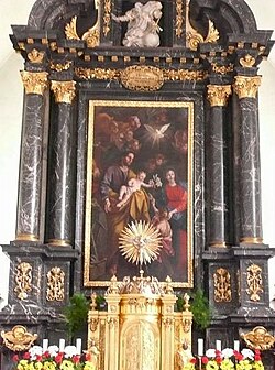 | Urfahr, Stadtpfarrkirche St. Josef. Hochaltar mit Altarblatt "Hl. Josef mit Jesuskind" von Johann Karl von Reslfeld. | Eigenes Werk | gerhard.anzinger@utanet.at | Datei:Stadtpfarrkirche Urfahr - Hochaltar.jpg |
