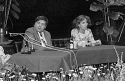 | im Schloss zum Thema "Wozu das Theater?". Auf der Bühne v.l.n.r. Regisseur und Autor George Tabori, Schriftsteller Wolfgang Bauer, Journalist Walther Schmieding als Moderator, Schauspielerin Ursula Lingen, Kulturattaché der jugoslawischen Botschaft Ivan Ivanji und Regisseur Wolfgang Spier. | Stadtarchiv Kiel | Magnussen, Friedrich (1914-1987) | Datei:Podiumsdiskussion zur Jahrestagung des Deutschen Bühnenvereins zur Kieler Woche 1976 (Kiel 67.658) (cropped).jpg | |