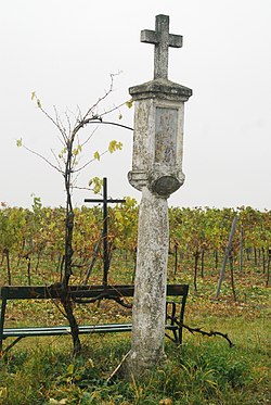 Auf einer runden Steinsäule sitzt ein an der Unterseite mit Weintraubengirlanden geschmückter Tabernakel, auf dem ein schlichtes Steinkreuz sitzt. An der der Straße zugewandten Seite befindet sich ein auf einer Blechplatte gemaltes Bild aus dem Jahr 2003.