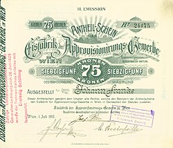 | Anteilschein an der Eisfabrik der Approvisionirungs-Gewerbe in Wien vom 1. Juli 1917 | Sammlung eines Mitglieds des Ersten Deutschen Historic-Actien-Clubs e.V. (EDHAC e.V.); (le) | Unbekannte Autoren und Grafiker; Scan vom EDHAC e.V. | Datei:Eisfabrik der Approvisionirungs-Gewerbe in Wien 1917.jpg | |